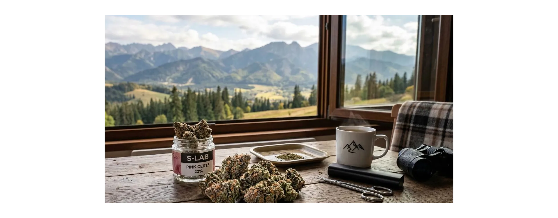 Ta nagradzana hybryda to dzieło amerykańskiej hodowli Compound Genetics, powstałe z krzyżówki odmian The Menthol i Grape Gasoline. W marcu 2026 roku Pink Certz trafiła do polskich aptek w ofercie Slab — zarówno w wariancie THC 18%, jak i THC 22%. Profil terpenowy z dominacją beta-kariofilenu, limonenu i linalolu nadaje jej charakterystyczny, wielowarstwowy aromat łączący miętową świeżość ze słodyczą winogron i paliwowym podtonem. Użytkownicy raportują zrównoważone działanie — łagodną stymulację psychiczną połączoną z relaksacją ciała, bez tendencji do nadmiernej sedacji. Może być interesującą propozycją dla pacjentów poszukujących hybrydy o wszechstronnym profilu efektów, choć o doborze odmiany zawsze decyduje lekarz prowadzący.